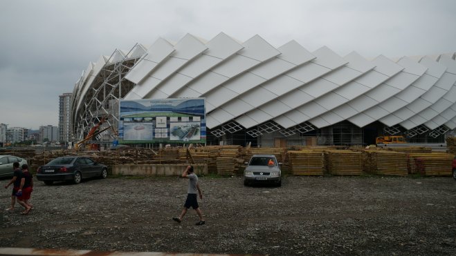 Drei Bier später wird es Zeit aufzubrechen. Die türkische Botschaft wartet. Im Schnellschritt geht es durch die Stadt. Hier wird derzeit ein riesen Stadion gebaut.